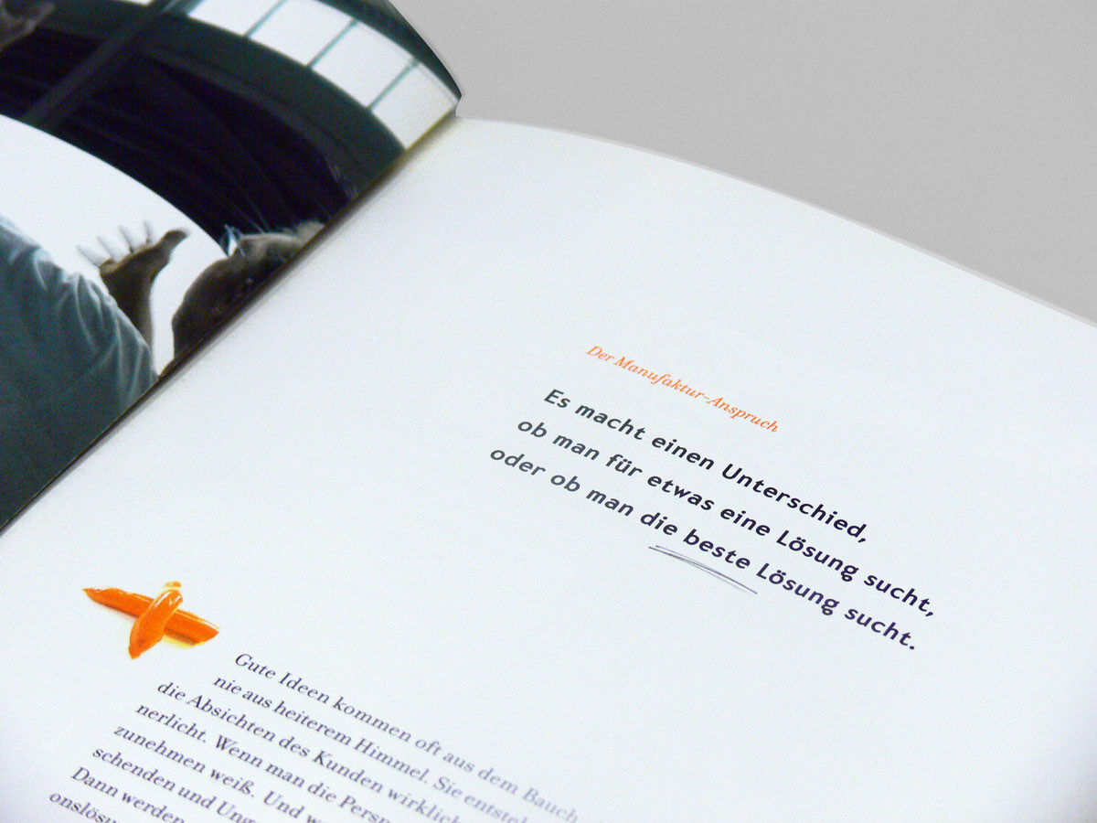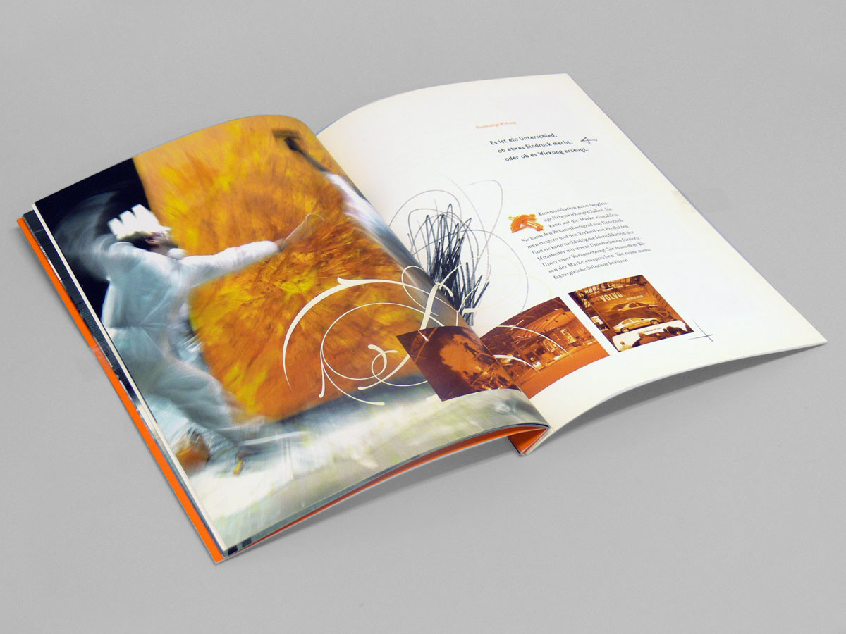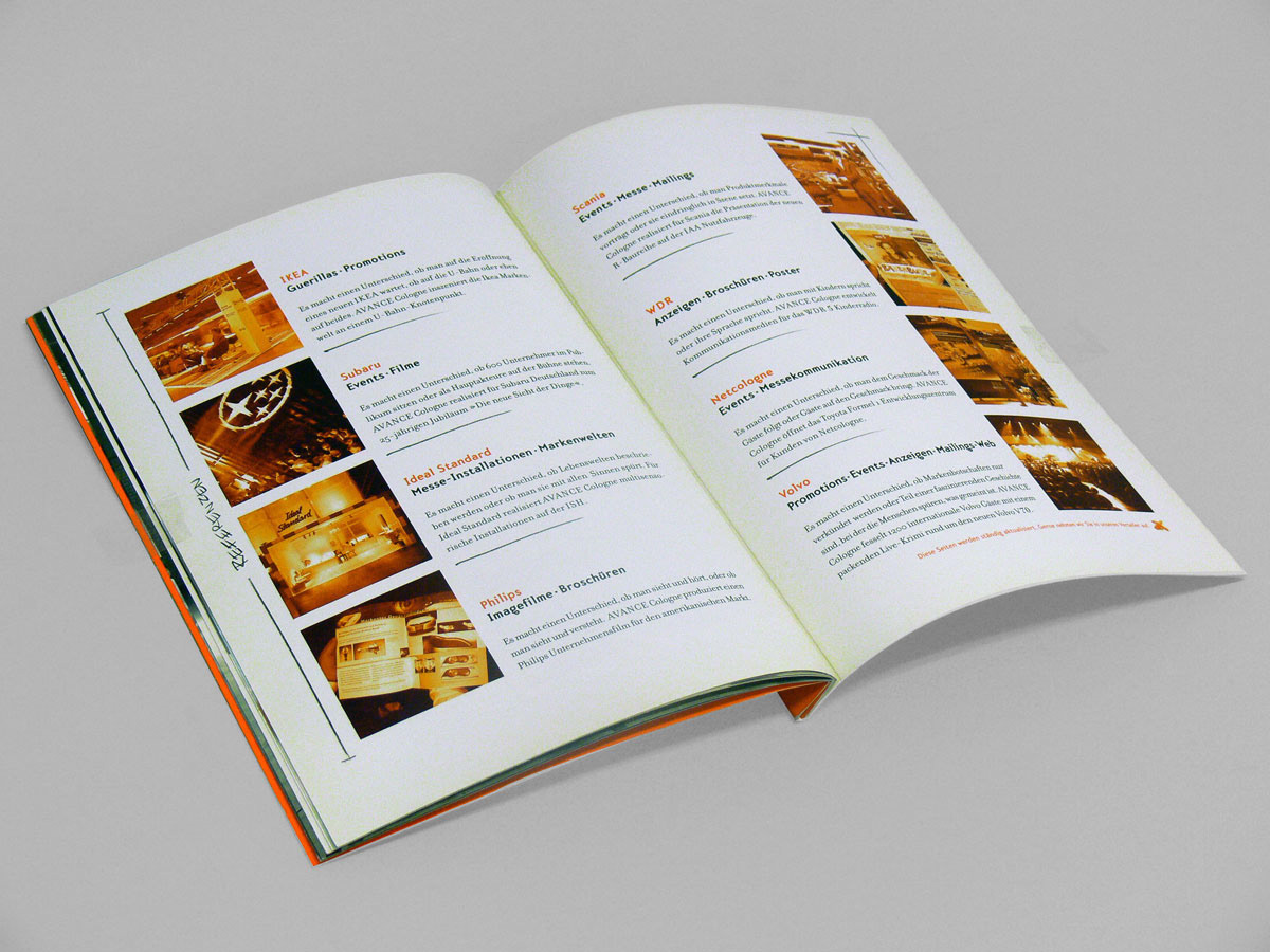 For the Cologne “Manufacture of Communication” we made the creation of their corporate brochure to a shared experience. Entirely in line with the idea of a manufacture, each brochure includes a piece of the original material from a large action painting created by the employees during the photo shooting. The brochure shows this documentation accompanied by the agencys examples of work. The concept made the brochure a unusual portfolio describing Avance Cologne as a innovative think tank operating with passion and working very much in a team spirit.