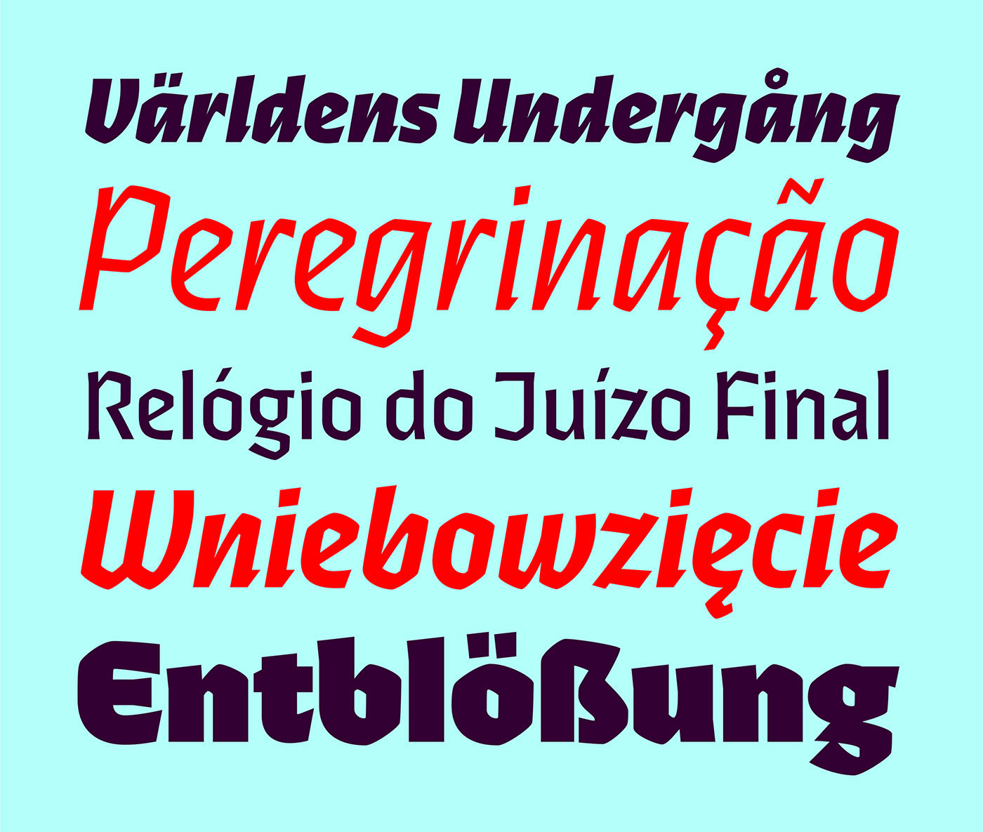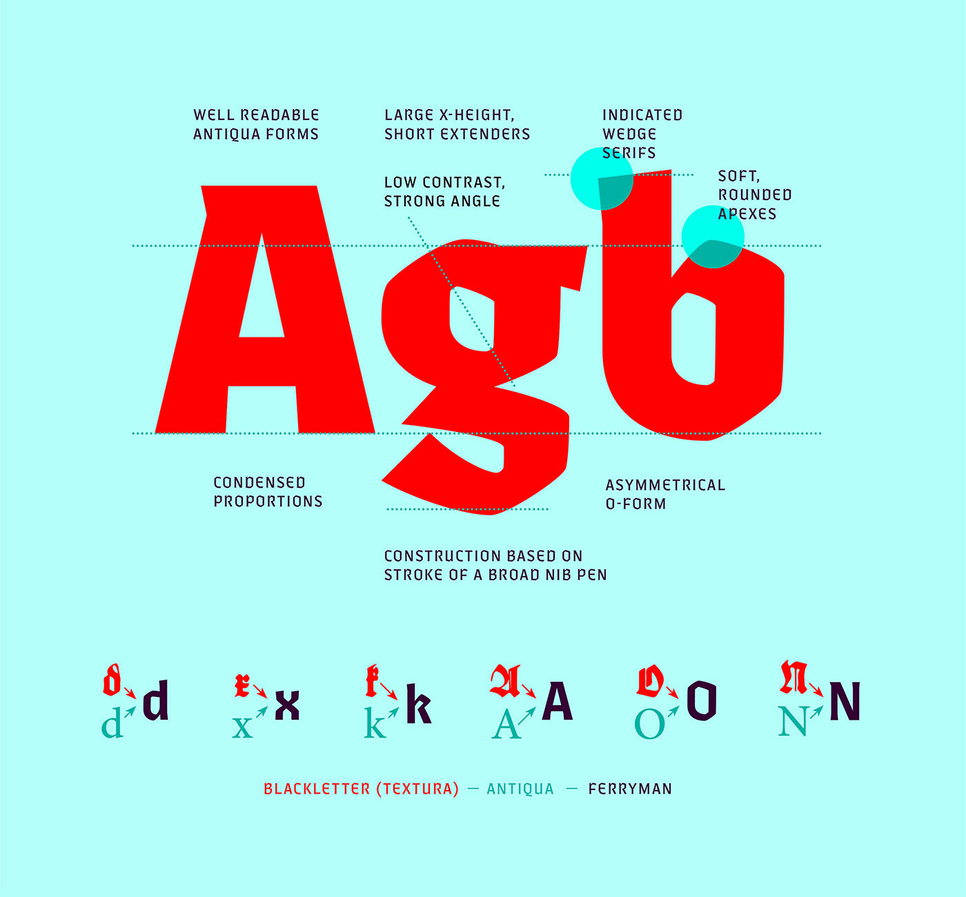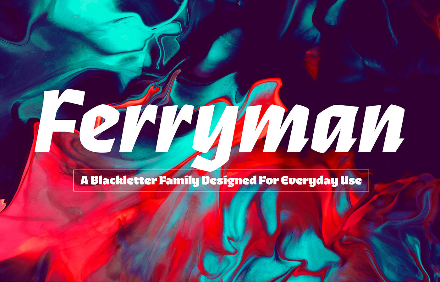 Ferryman is a Blackletter typeface for the contemporary reader. Unfamiliar Blackletter characters have been replaced with adapted common Latin characters (Antiqua) or with letters from other historical scripts that are more legible to a modern audience.