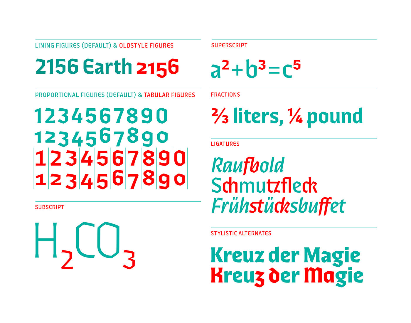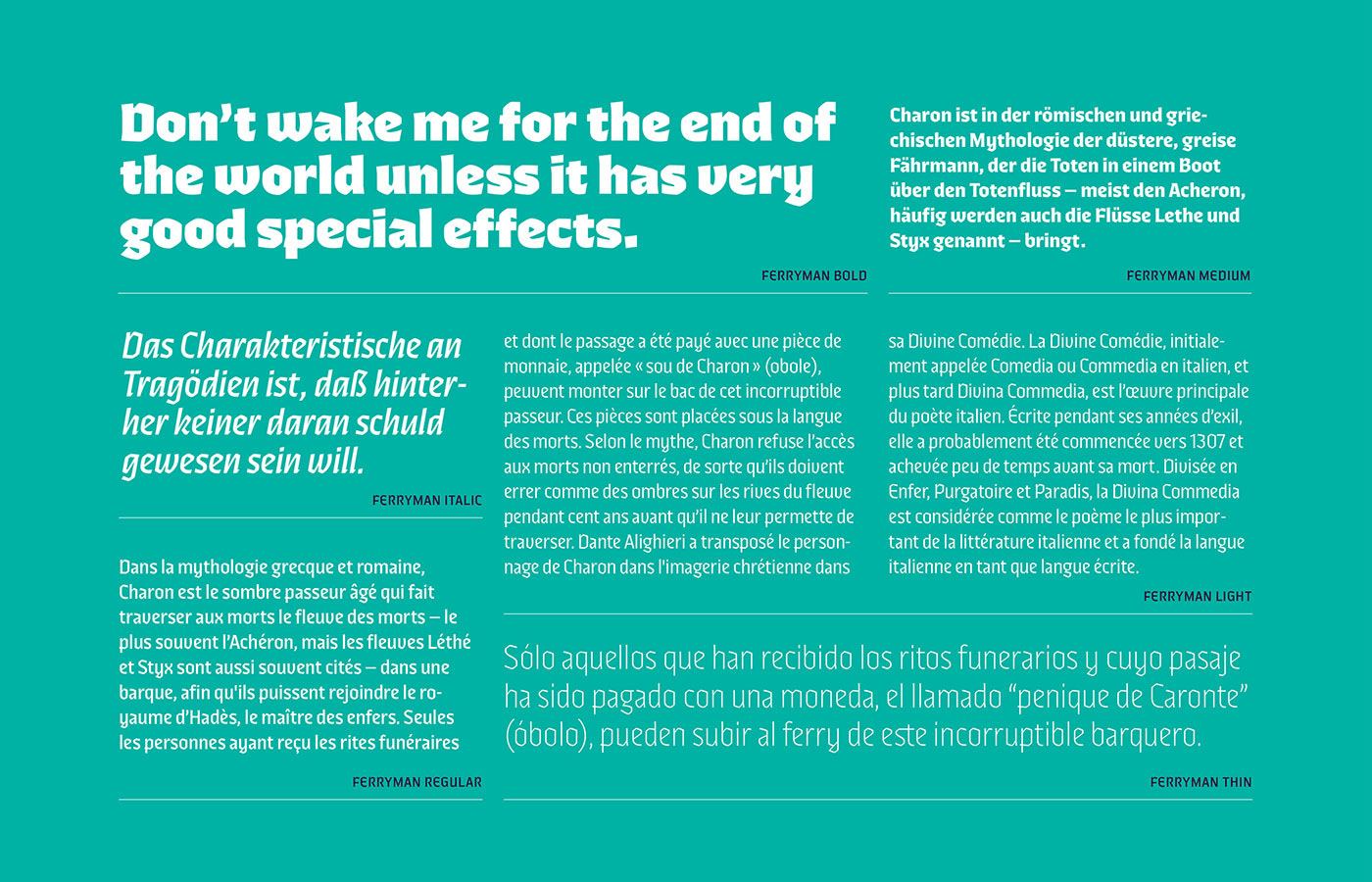 With nine weights and corresponding italics Ferryman offers a wide range of creative possibilities. Each style offers 590 glyphs supporting all Western-, Eastern- and Central-European languages and comes with four sets of numbers and various currency symbols. For maximum usability Ferryman offers alternatives for many glyphs allowing to choose between best readability and historical richness of expression.