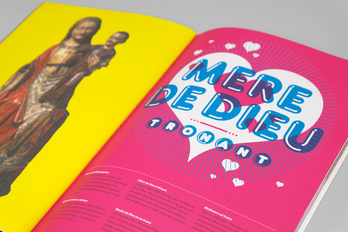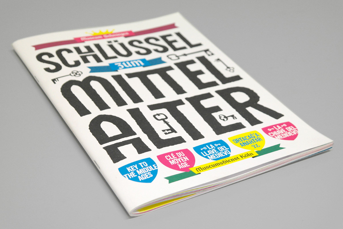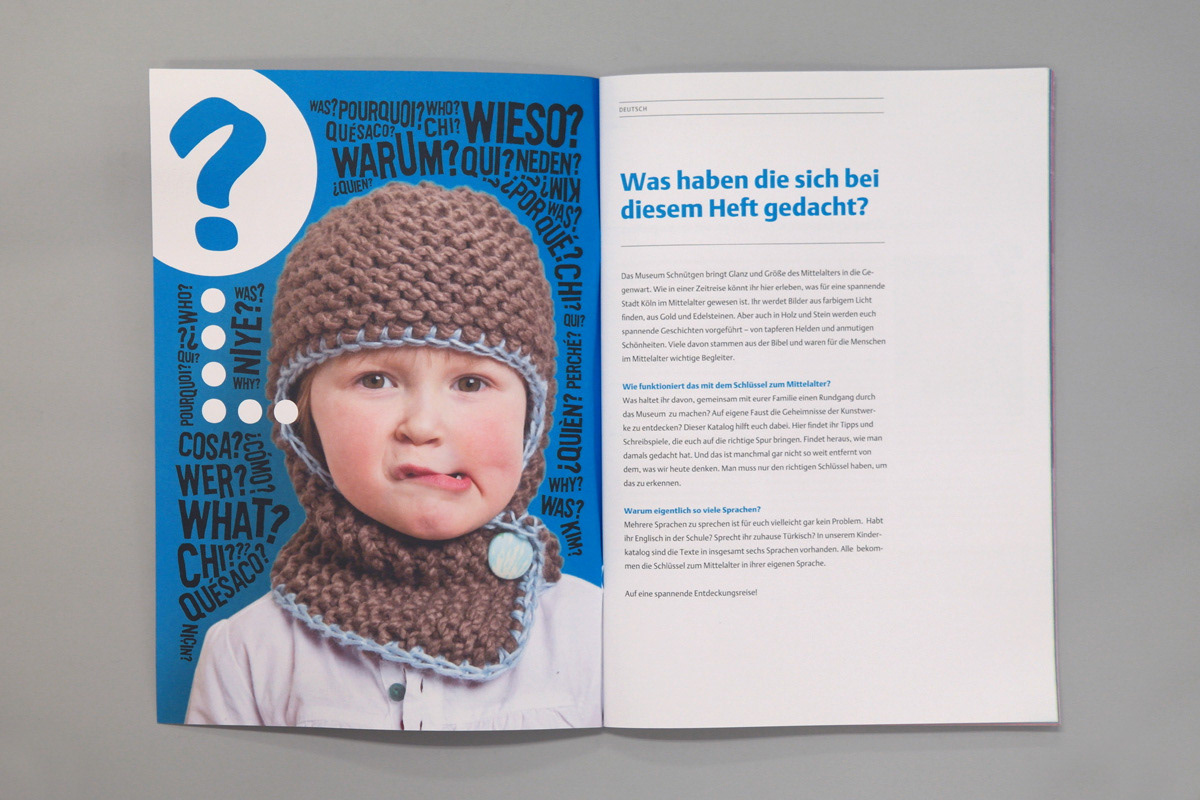 Accompanying the exhibition »Glanz und Größe des Mittelalters« at the Museum Schnütgen Cologne we created an interactive catalogue especially for children, set up in six languages. Visiting the exhibition, the young visitors can explore by their own works of art and deal with each object puzzles and tasks. In the catalog, the objects are presented in a child-oriented way with many citations to the design aesthetics of comics, movies, pop culture, footballclubs and computergames. In addition to this projects are shown by other children they are produced in the forefront of artworks.